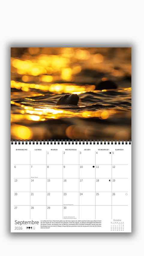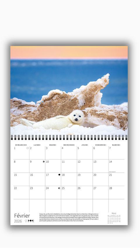 La collection complète 2026 de Nature en vue réunit les quatre calendriers de l’année – Nature Sauvage, 100 % Oiseaux, 100 % Orignaux et l’édition spéciale 100 % Phoques. Ensemble, ils forment un voyage unique à travers la faune et les paysages du Québec, vus à travers l’œil passionné d’Éric Deschamps. Réunis dans un seul ensemble, ces quatre calendriers offrent une expérience complète qui traverse les saisons, les habitats et les espèces emblématiques du Québec. Chaque mois, vous découvrirez non seulement une photographie inédite, mais aussi un texte informatif et captivant rédigé par Éric lui-même, enrichi de « Saviez-vous que » pour approfondir votre regard sur la nature.